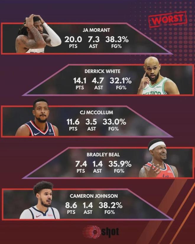 新赛季至今,最让人失望的球队无疑是独行侠和快船。截至今天赛前,独行侠2胜6负排名西部第15,快船3胜5负排名西部第12。最让人失望的球员是谁?美媒选出了以下5名球员:莫兰特、怀特、麦科勒姆、比尔和卡梅伦-约翰逊。