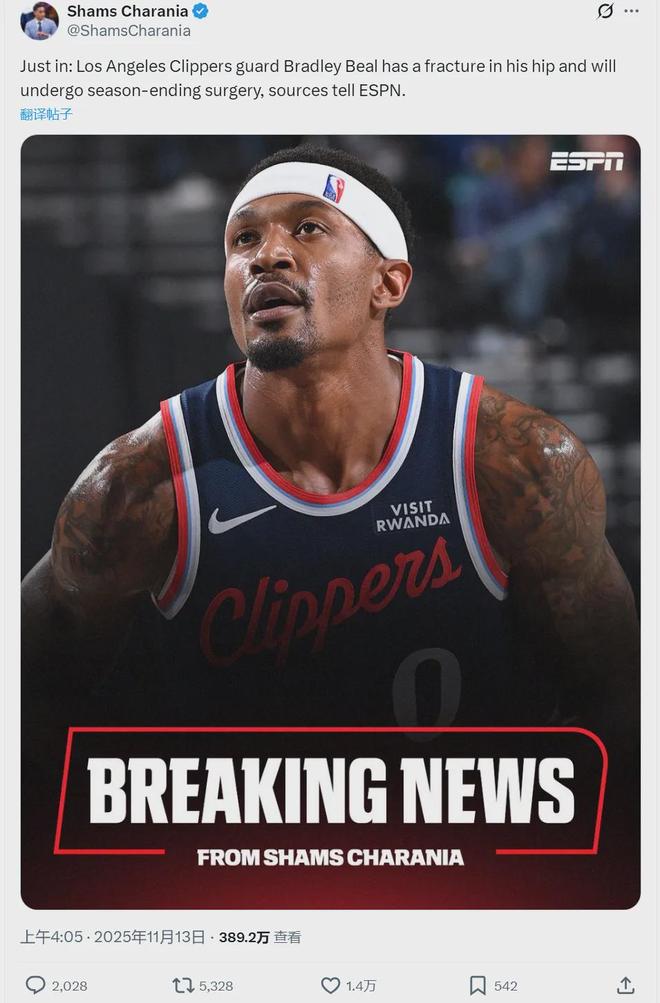 今天早些时候据NBA名记Shams报道,快船后卫布拉德利·比尔遭遇了髋部骨折,他是在上周末跟太阳的比赛里受伤的。